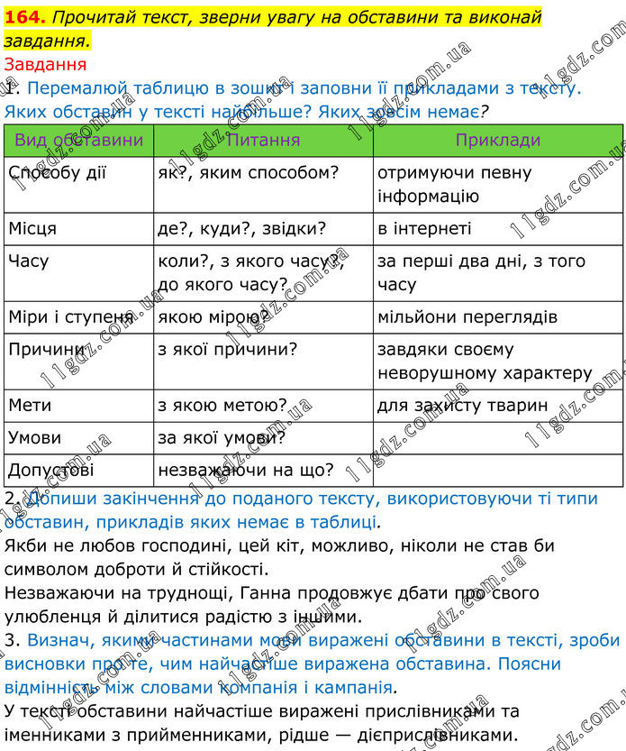 164. Прочитай текст, зверни увагу на обставини та виконай завдання. Завдання 1. Перемалюй таблицю в зошит і заповни її прикладами з тексту. Яких обставин у тексті найбільше? Яких зовсім немає? Вид обставини Питання Приклади Способу дії як?, яким способом? отримуючи певну інформацію Місця де?, куди?, звідки? в інтернеті Часу коли?, з якого часу?, до якого часу? за перші два дні, з того часу Міри і ступеня якою мірою? мільйони переглядів Причини з якої причини? завдяки своєму неворушному характеру Мети з якою метою? для захисту тварин Умови за якої умови? Допустові незважаючи на що? 2. Допиши закінчення до поданого тексту, використовуючи ті типи обставин, прикладів яких немає в таблиці. Якби не любов господині, цей кіт, можливо, ніколи не став би символом доброти й стійкості. Незважаючи на труднощі, Ганна продовжує дбати про свого улюбленця й ділитися радістю з іншими. 3. Визнач, якими частинами мови виражені обставини в тексті, зроби висновки про те, чим найчастіше виражена обставина. Поясни відмінність між словами компанія і кампанія. У тексті обставини найчастіше виражені прислівниками та іменниками з прийменниками, рідше — дієприслівниками.