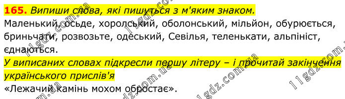 165. Випиши слова, які пишуться з м'яким знаком. Маленький, осьде, хоролський, оболонський, мільйон, обурюється, бриньчати, розвозьте, одеський, Севілья, теленькати, альпініст, єднаються. У виписаних словах підкресли першу літеру – і прочитай закінчення українського прислів'я «Лежачий камінь мохом обростає».