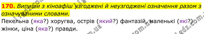 170. Випиши з кіноафіш узгоджені й неузгоджені означення разом з означуваними словами. Пекельна (яка?) хоругва, острів (який?) фантазій, маленькі (які?) жінки, ціна (яка?) правди.