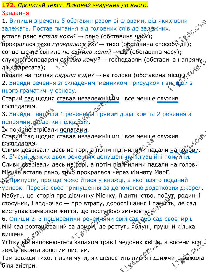172. Прочитай текст. Виконай завдання до нього. Завдання 1. Випиши з речень 5 обставин разом зі словами, від яких вони залежать. Постав питання від головних слів до залежних. встала рано встала коли? → рано (обставина часу); прокралася тихо прокралася як? → тихо (обставина способу дії); сонце ще не світило не світило коли? → ще (обставина часу); служив господарям служив кому? → господарям (обставина напряму дії / адресата); падали на голови падали куди? → на голови (обставина місця). 2. Знайди речення зі складеним іменником присудком і випиши з нього граматичну основу. Старий сад щодня ставав незалежнішим і все менше служив господарям. 3. Знайди і випиши 1 речення з прямим додатком та 2 речення з непрямим. Додатки підкресли. Їх покірно згрібали лопатами. Старий сад щодня ставав незалежнішим і все менше служив господарям. Сливи дозрівали десь на горі, а потім підгнилими падали на голови. 4. З'ясуй, у яких двох реченнях допущені пунктуаційні помилки. Сливи дозрівали десь на горі, а потім підгнилими падали на голови Мієчка встала рано, тихо прокралася через кімнату Марії. 5. Припусти, про що може йтися у книжці, з якої взято поданий уривок. Перевір своє припущення за допомогою додаткових джерел. Мабуть, це історія про дівчинку Мієчку, її дитинство, побут, родинні стосунки, і водночас — про втрату, дорослішання і пам’ять, де сад виступає символом життя, що поступово змінюється 6. Опиши 2–3 поширеними реченнями свій сад або сад своєї мрії. Мій сад розташований за домом, де ростуть яблуні, груші й кілька вишень. Улітку він наповнюється запахом трав і медових квітів, а восени вся земля вкрита золотим листям. Там завжди тихо, тільки чути, як шелестить листя і дзижчить бджола біля айстри.