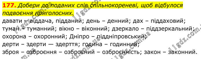 177. Добери до поданих слів спільнокореневі, щоб відбулося подвоєння приголосних. давати – віддача, підданий; день – денний; дах – піддаховий; туман – туманний; вікно – віконний; дзеркало – піддзеркальний; охорона – охоронний; Дніпро – піддніпровський; дерти – здерти — здерття; година – годинний; зброя – озброєння – озброєний – озброєнність; закон – законний.