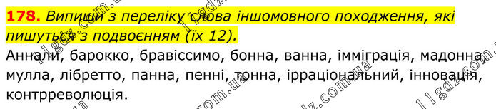 178. Випиши з переліку слова іншомовного походження, які пишуться з подвоєнням (їх 12). Аннали, барокко, бравіссимо, бонна, ванна, імміграція, мадонна, мулла, лібретто, панна, пенні, тонна, ірраціональний, інновація, контрреволюція.