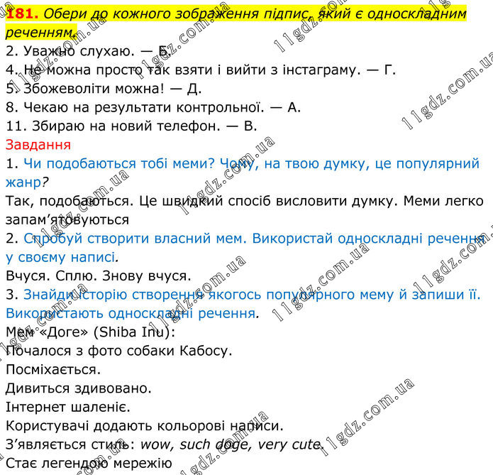 181. Обери до кожного зображення підпис, який є односкладним реченням. 2. Уважно слухаю. — Б. 4. Не можна просто так взяти і вийти з інстаграму. — Г. 5. Збожеволіти можна! — Д. 8. Чекаю на результати контрольної. — А. 11. Збираю на новий телефон. — В. Завдання 1. Чи подобаються тобі меми? Чому, на твою думку, це популярний жанр? Так, подобаються. Це швидкий спосіб висловити думку. Меми легко запам’ятовуються 2. Спробуй створити власний мем. Використай односкладні речення у своєму написі. Вчуся. Сплю. Знову вчуся. 3. Знайди історію створення якогось популярного мему й запиши її. Використають односкладні речення. Мем «Догe» (Shiba Inu): Почалося з фото собаки Кабосу. Посміхається. Дивиться здивовано. Інтернет шаленіє. Користувачі додають кольорові написи. З’являється стиль: wow, such doge, very cute. Стає легендою мережію.