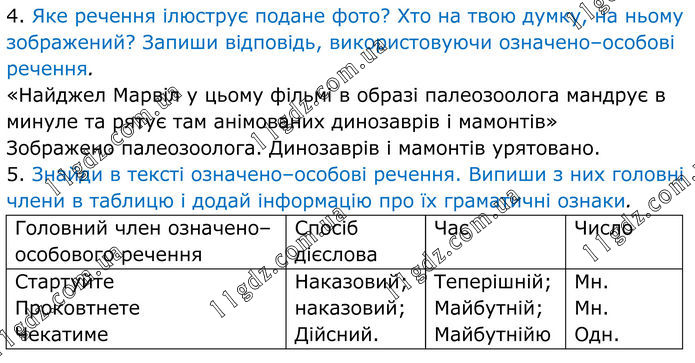4. Яке речення ілюструє подане фото? Хто на твою думку, на ньому зображений? Запиши відповідь, використовуючи означено–особові речення. «Найджел Марвіл у цьому фільмі в образі палеозоолога мандрує в минуле та рятує там анімованих динозаврів і мамонтів» Зображено палеозоолога. Динозаврів і мамонтів урятовано. 5. Знайди в тексті означено–особові речення. Випиши з них головні члени в таблицю і додай інформацію про їх граматичні ознаки.