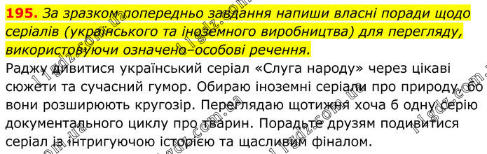 195. За зразком попередньо завдання напиши власні поради щодо серіалів (українського та іноземного виробництва) для перегляду, використовуючи означено–особові речення. Раджу дивитися український серіал «Слуга народу» через цікаві сюжети та сучасний гумор. Обираю іноземні серіали про природу, бо вони розширюють кругозір. Переглядаю щотижня хоча б одну серію документального циклу про тварин. Порадьте друзям подивитися серіал із інтригуючою історією та щасливим фіналом.