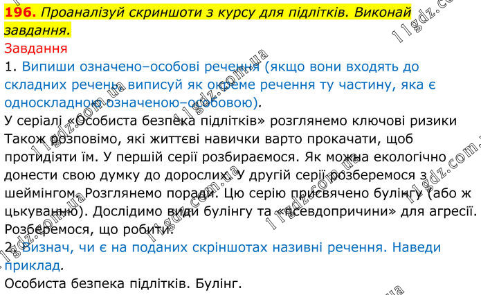 196. Проаналізуй скриншоти з курсу для підлітків. Виконай завдання. Завдання 1. Випиши означено–особові речення (якщо вони входять до складних речень, виписуй як окреме речення ту частину, яка є односкладною означеною–особовою). У серіалі «Особиста безпека підлітків» розглянемо ключові ризики Також розповімо, які життєві навички варто прокачати, щоб протидіяти їм. У першій серії розбираємося. Як можна екологічно донести свою думку до дорослих. У другій серії розберемося з шеймінгом. Розглянемо поради. Цю серію присвячено булінгу (або ж цькуванню). Дослідимо види булінгу та «псевдопричини» для агресії. Розберемося, що робити. 2. Визнач, чи є на поданих скріншотах називні речення. Наведи приклад. Особиста безпека підлітків. Булінг.
