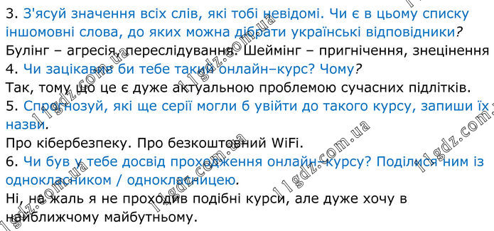 3. З'ясуй значення всіх слів, які тобі невідомі. Чи є в цьому списку іншомовні слова, до яких можна дібрати українські відповідники? Булінг – агресія, переслідування. Шеймінг – пригнічення, знецінення 4. Чи зацікавив би тебе такий онлайн–курс? Чому? Так, тому що це є дуже актуальною проблемою сучасних підлітків. 5. Спрогнозуй, які ще серії могли б увійти до такого курсу, запиши їх назви. Про кібербезпеку. Про безкоштовний WiFi. 6. Чи був у тебе досвід проходження онлайн–курсу? Поділися ним із однокласником / однокласницею. Ні, на жаль я не проходив подібні курси, але дуже хочу в найближчому майбутньому.