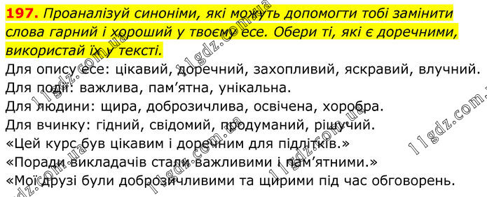 197. Проаналізуй синоніми, які можуть допомогти тобі замінити слова гарний і хороший у твоєму есе. Обери ті, які є доречними, використай їх у тексті. Для опису есе: цікавий, доречний, захопливий, яскравий, влучний. Для події: важлива, пам’ятна, унікальна. Для людини: щира, доброзичлива, освічена, хоробра. Для вчинку: гідний, свідомий, продуманий, рішучий. «Цей курс був цікавим і доречним для підлітків.» «Поради викладачів стали важливими і пам’ятними.» «Мої друзі були доброзичливими та щирими під час обговорень.