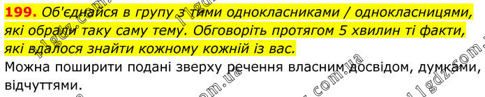 199. Об'єднайся в групу з тими однокласниками / однокласницями, які обрали таку саму тему. Обговоріть протягом 5 хвилин ті факти, які вдалося знайти кожному кожній із вас. Можна поширити подані зверху речення власним досвідом, думками, відчуттями.
