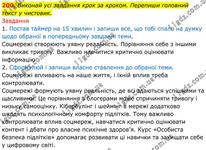 200. Виконай усі завдання крок за кроком. Перепиши головний текст у чистовик. Завдання 1. Постав таймер на 15 хвилин і запиши все, що тобі спало на думку щодо обраної в попередньому завданні теми. Соцмережі створюють уявну реальність. Порівняння себе з іншими викликає тривогу. Важливо навчитися критично оцінювати інформацію 2. Сформулюй і запиши власне ставлення до обраної теми. Соцмережі впливають на наше життя, і їхній вплив треба контролювати. Соцмережі формують уявну реальність, де всі здаються успішними та щасливими. Це порівняння з блогерами може спричиняти тривогу і низьку самооцінку. Кібербулінг і шеймінг в мережі додатково шкодять психологічному комфорту підлітків. Тому важливо контролювати вплив соцмереж, навчатися критично оцінювати контент і дбати про власне психічне здоров’я. Курс «Особиста безпека підлітків» допомагає розвивати ці навички та захищати себе у цифровому світі.