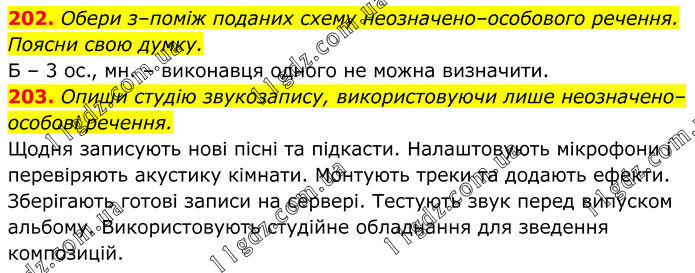 202. Обери з–поміж поданих схему неозначено–особового речення. Поясни свою думку. Б – 3 ос., мн. – виконавця одного не можна визначити. 203. Опиши студію звукозапису, використовуючи лише неозначено–особові речення. Щодня записують нові пісні та підкасти. Налаштовують мікрофони і перевіряють акустику кімнати. Монтують треки та додають ефекти. Зберігають готові записи на сервері. Тестують звук перед випуском альбому. Використовують студійне обладнання для зведення композицій.