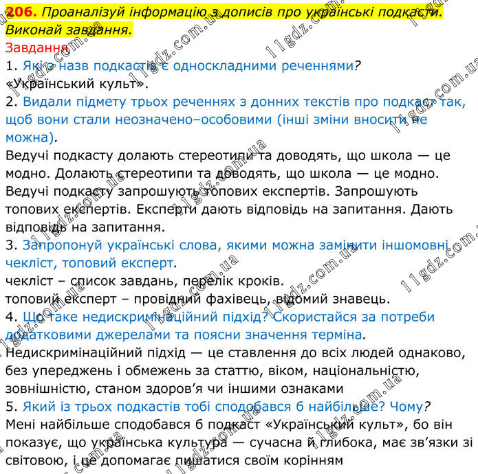 206. Проаналізуй інформацію з дописів про українські подкасти. Виконай завдання. Завдання 1. Які з назв подкастів є односкладними реченнями? «Український культ». 2. Видали підмету трьох реченнях з донних текстів про подкаст так, щоб вони стали неозначено–особовими (інші зміни вносити не можна). Ведучі подкасту долають стереотипи та доводять, що школа — це модно. Долають стереотипи та доводять, що школа — це модно. Ведучі подкасту запрошують топових експертів. Запрошують топових експертів. Експерти дають відповідь на запитання. Дають відповідь на запитання. 3. Запропонуй українські слова, якими можна замінити іншомовні чекліст, топовий експерт. чекліст – список завдань, перелік кроків. топовий експерт – провідний фахівець, відомий знавець. 4. Що таке недискримінаційний підхід? Скористайся за потреби додатковими джерелами та поясни значення терміна. Недискримінаційний підхід — це ставлення до всіх людей однаково, без упереджень і обмежень за статтю, віком, національністю, зовнішністю, станом здоров’я чи іншими ознаками 5. Який із трьох подкастів тобі сподобався б найбільше? Чому? Мені найбільше сподобався б подкаст «Український культ», бо він показує, що українська культура — сучасна й глибока, має зв’язки зі світовою, і це допомагає пишатися своїм корінням.