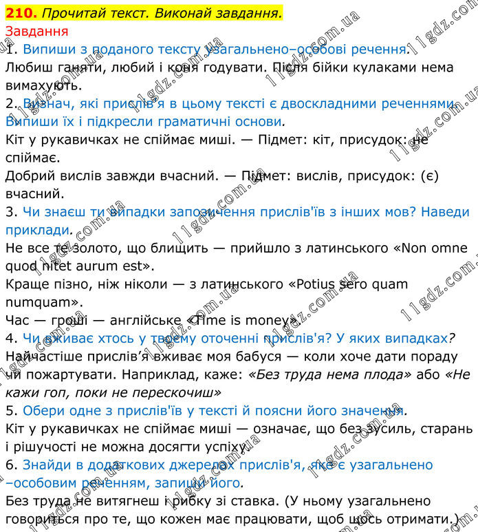 210. Прочитай текст. Виконай завдання. Завдання 1. Випиши з поданого тексту узагальнено–особові речення. Любиш ганяти, любий і коня годувати. Після бійки кулаками нема вимахують. 2. Визнач, які прислів'я в цьому тексті є двоскладними реченнями. Випиши їх і підкресли граматичні основи. Кіт у рукавичках не спіймає миші. — Підмет: кіт, присудок: не спіймає. Добрий вислів завжди вчасний. — Підмет: вислів, присудок: (є) вчасний. 3. Чи знаєш ти випадки запозичення прислів'їв з інших мов? Наведи приклади. Не все те золото, що блищить — прийшло з латинського «Non omne quod nitet aurum est». Краще пізно, ніж ніколи — з латинського «Potius sero quam numquam». Час — гроші — англійське «Time is money». 4. Чи вживає хтось у твоєму оточенні прислів'я? У яких випадках? Найчастіше прислів’я вживає моя бабуся — коли хоче дати пораду чи пожартувати. Наприклад, каже: «Без труда нема плода» або «Не кажи гоп, поки не перескочиш» 5. Обери одне з прислів'їв у тексті й поясни його значення. Кіт у рукавичках не спіймає миші — означає, що без зусиль, старань і рішучості не можна досягти успіху. 6. Знайди в додаткових джерелах прислів'я, яке є узагальнено –особовим реченням, запиши його. Без труда не витягнеш і рибку зі ставка. (У ньому узагальнено говориться про те, що кожен має працювати, щоб щось отримати.)