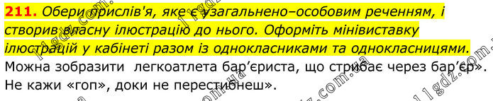 211. Обери прислів'я, яке є узагальнено–особовим реченням, і створив власну ілюстрацію до нього. Оформіть мінівиставку ілюстрацій у кабінеті разом із однокласниками та однокласницями. Можна зобразити легкоатлета бар’єриста, що стрибає через бар’єр». Не кажи «гоп», доки не перестибнеш».