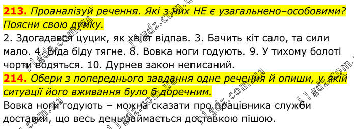 213. Проаналізуй речення. Які з них НЕ є узагальнено–особовими? Поясни свою думку. 2. Здогадався цуцик, як хвіст відпав. 3. Бачить кіт сало, та сили мало. 4. Біда біду тягне. 8. Вовка ноги годують. 9. У тихому болоті чорти водяться. 10. Дурнев закон неписаний. 214. Обери з попереднього завдання одне речення й опиши, у якій ситуації його вживання було б доречним. Вовка ноги годують – можна сказати про працівника служби доставки, що весь день займається доставкою пішою.