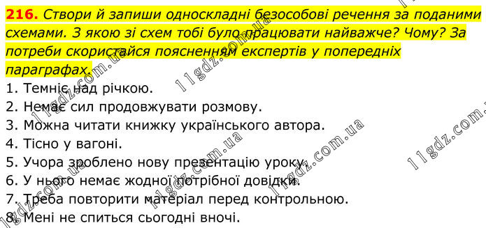 216. Створи й запиши односкладні безособові речення за поданими схемами. З якою зі схем тобі було працювати найважче? Чому? За потреби скористайся поясненням експертів у попередніх параграфах. 1. Темніє над річкою. 2. Немає сил продовжувати розмову. 3. Можна читати книжку українського автора. 4. Тісно у вагоні. 5. Учора зроблено нову презентацію уроку. 6. У нього немає жодної потрібної довідки. 7. Треба повторити матеріал перед контрольною. 8. Мені не спиться сьогодні вночі.