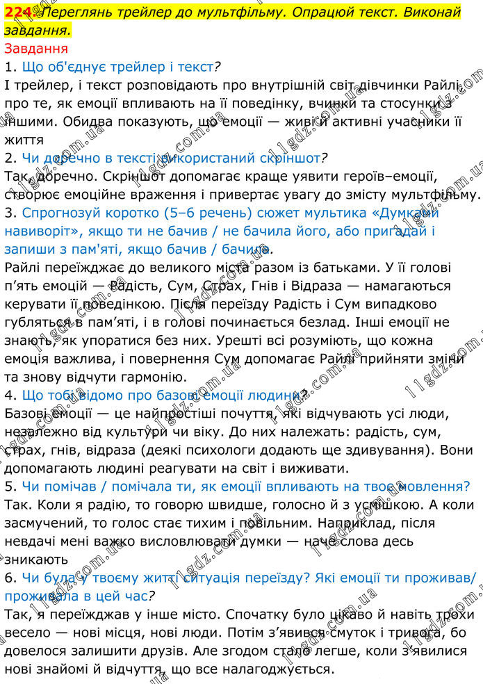 224. Переглянь трейлер до мультфільму. Опрацюй текст. Виконай завдання. Завдання 1. Що об'єднує трейлер і текст? І трейлер, і текст розповідають про внутрішній світ дівчинки Райлі, про те, як емоції впливають на її поведінку, вчинки та стосунки з іншими. Обидва показують, що емоції — живі й активні учасники її життя 2. Чи доречно в тексті використаний скріншот? Так, доречно. Скріншот допомагає краще уявити героїв–емоції, створює емоційне враження і привертає увагу до змісту мультфільму. 3. Спрогнозуй коротко (5–6 речень) сюжет мультика «Думками навиворіт», якщо ти не бачив / не бачила його, або пригадай і запиши з пам'яті, якщо бачив / бачила. Райлі переїжджає до великого міста разом із батьками. У її голові п’ять емоцій — Радість, Сум, Страх, Гнів і Відраза — намагаються керувати її поведінкою. Після переїзду Радість і Сум випадково губляться в пам’яті, і в голові починається безлад. Інші емоції не знають, як упоратися без них. Урешті всі розуміють, що кожна емоція важлива, і повернення Сум допомагає Райлі прийняти зміни та знову відчути гармонію. 4. Що тобі відомо про базові емоції людини? Базові емоції — це найпростіші почуття, які відчувають усі люди, незалежно від культури чи віку. До них належать: радість, сум, страх, гнів, відраза (деякі психологи додають ще здивування). Вони допомагають людині реагувати на світ і виживати. 5. Чи помічав / помічала ти, як емоції впливають на твоє мовлення? Так. Коли я радію, то говорю швидше, голосно й з усмішкою. А коли засмучений, то голос стає тихим і повільним. Наприклад, після невдачі мені важко висловлювати думки — наче слова десь зникають 6. Чи була у твоєму житті ситуація переїзду? Які емоції ти проживав/ проживала в цей час? Так, я переїжджав у інше місто. Спочатку було цікаво й навіть трохи весело — нові місця, нові люди. Потім з’явився смуток і тривога, бо довелося залишити друзів. Але згодом стало легше, коли з’явилися нові знайомі й відчуття, що все налагоджується.