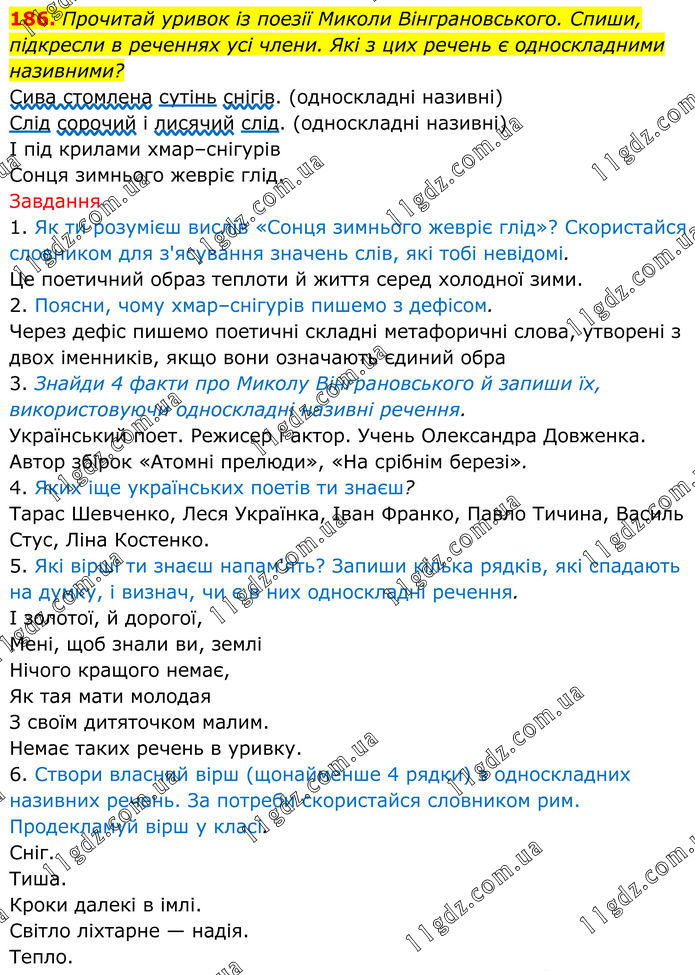 186. Прочитай уривок із поезії Миколи Вінграновського. Спиши, підкресли в реченнях усі члени. Які з цих речень є односкладними називними? Сива стомлена сутінь снігів. (односкладні називні) Слід сорочий і лисячий слід. (односкладні називні) І під крилами хмар–снігурів Сонця зимнього жевріє глід. Завдання 1. Як ти розумієш вислів «Сонця зимнього жевріє глід»? Скористайся словником для з'ясування значень слів, які тобі невідомі. Це поетичний образ теплоти й життя серед холодної зими. 2. Поясни, чому хмар–снігурів пишемо з дефісом. Через дефіс пишемо поетичні складні метафоричні слова, утворені з двох іменників, якщо вони означають єдиний обра 3. Знайди 4 факти про Миколу Вінграновського й запиши їх, використовуючи односкладні називні речення. Український поет. Режисер і актор. Учень Олександра Довженка. Автор збірок «Атомні прелюди», «На срібнім березі». 4. Яких іще українських поетів ти знаєш? Тарас Шевченко, Леся Українка, Іван Франко, Павло Тичина, Василь Стус, Ліна Костенко. 5. Які вірші ти знаєш напам'ять? Запиши кілька рядків, які спадають на думку, і визнач, чи є в них односкладні речення. І золотої, й дорогої, Мені, щоб знали ви, землі Нічого кращого немає, Як тая мати молодая З своїм дитяточком малим. Немає таких речень в уривку. 6. Створи власний вірш (щонайменше 4 рядки) з односкладних називних речень. За потреби скористайся словником рим. Продекламуй вірш у класі. Сніг. Тиша. Кроки далекі в імлі. Світло ліхтарне — надія. Тепло.