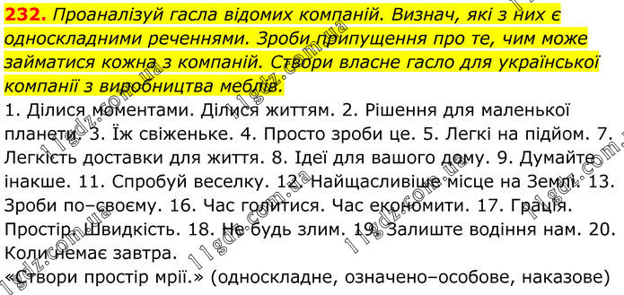 232. Проаналізуй гасла відомих компаній. Визнач, які з них є односкладними реченнями. Зроби припущення про те, чим може займатися кожна з компаній. Створи власне гасло для української компанії з виробництва меблів. 1. Ділися моментами. Ділися життям. 2. Рішення для маленької планети. 3. Їж свіженьке. 4. Просто зроби це. 5. Легкі на підйом. 7. Легкість доставки для життя. 8. Ідеї для вашого дому. 9. Думайте інакше. 11. Спробуй веселку. 12. Найщасливіше місце на Землі. 13. Зроби по–своєму. 16. Час голитися. Час економити. 17. Грація. Простір. Швидкість. 18. Не будь злим. 19. Залиште водіння нам. 20. Коли немає завтра. «Створи простір мрії.» (односкладне, означено–особове, наказове)