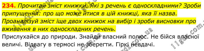 234. Прочитай зміст книжки. Які з речень є односкладними? Зроби припущення: про що може йтися в цій книжці, яка її назва. Проаналізуй зміст іще двох книжок на вибір і зроби висновки про вживання в них односкладних речень. Прислухайся до природи. Знайди власний полюс. Не бійся власної величі. Відвагу в термосі не зберегти. Гіркі невдачі.