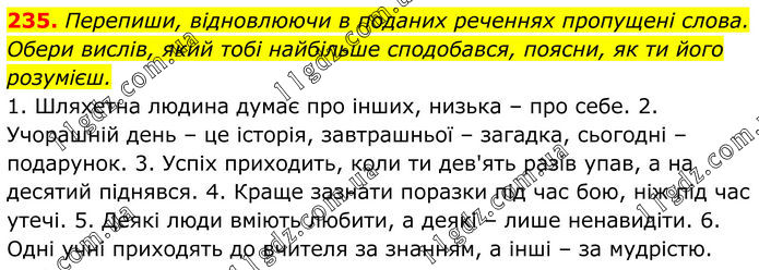 235. Перепиши, відновлюючи в поданих реченнях пропущені слова. Обери вислів, який тобі найбільше сподобався, поясни, як ти його розумієш. 1. Шляхетна людина думає про інших, низька – про себе. 2. Учорашній день – це історія, завтрашньої – загадка, сьогодні – подарунок. 3. Успіх приходить, коли ти дев'ять разів упав, а на десятий піднявся. 4. Краще зазнати поразки під час бою, ніж під час утечі. 5. Деякі люди вміють любити, а деякі – лише ненавидіти. 6. Одні учні приходять до вчителя за знанням, а інші – за мудрістю.