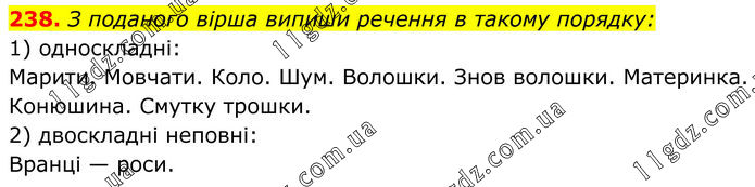 238. З поданого вірша випиши речення в такому порядку: 1) односкладні: Марити. Мовчати. Коло. Шум. Волошки. Знов волошки. Материнка. Конюшина. Смутку трошки. 2) двоскладні неповні: Вранці — роси.