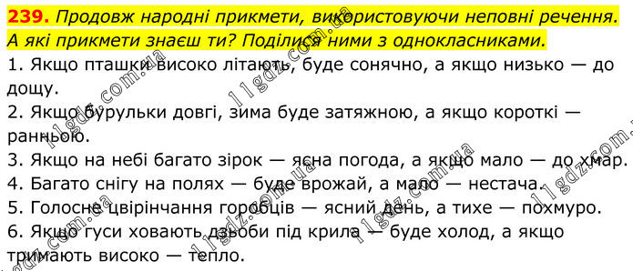 239. Продовж народні прикмети, використовуючи неповні речення. А які прикмети знаєш ти? Поділися ними з однокласниками. 1. Якщо пташки високо літають, буде сонячно, а якщо низько — до дощу. 2. Якщо бурульки довгі, зима буде затяжною, а якщо короткі — ранньою. 3. Якщо на небі багато зірок — ясна погода, а якщо мало — до хмар. 4. Багато снігу на полях — буде врожай, а мало — нестача. 5. Голосне цвірінчання горобців — ясний день, а тихе — похмуро. 6. Якщо гуси ховають дзьоби під крила — буде холод, а якщо тримають високо — тепло.