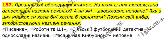 187. Проаналізуй обкладинки книжок. На яких із них використано односкладні називні речення? А на які – двоскладне неповне? Яку з цих книжок ти хотів би/ хотіла б прочитати? Поясни свій вибір, використовуючи називні речення. «Писанка», «Роботи та ШІ», «Сільськй футбольний детектив» – односкладні називні. «Місяць над Кінбурном» – неповне.