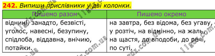 242. Випиши прислівники у дві колонки. Пишемо разом Пишемо окремо віднині, занадто, безвісті, уголос, навесні, безупину, спідлоба, віддавна, внічию, потайки. на завтра, без відома, без угаву, у розтіч, на відмінно, на жаль, на щастя, до вподоби, до речі, по суті.