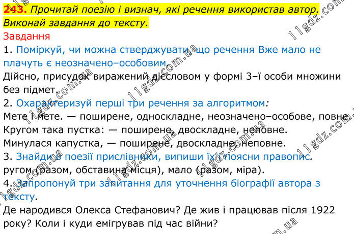 243. Прочитай поезію і визнач, які речення використав автор. Виконай завдання до тексту. Завдання 1. Поміркуй, чи можна стверджувати, що речення Вже мало не плачуть є неозначено–особовим. Дійсно, присудок виражений дієсловом у формі 3–ї особи множини без підмет. 2. Охарактеризуй перші три речення за алгоритмом: Мете і мете. — поширене, односкладне, неозначено–особове, повне. Кругом така пустка: — поширене, двоскладне, неповне. Минулася капустка, — поширене, двоскладне, неповне. 3. Знайди в поезії прислівники, випиши їх і поясни правопис. ругом (разом, обставина місця), мало (разом, міра). 4. Запропонуй три запитання для уточнення біографії автора з тексту. Де народився Олекса Стефанович? Де жив і працював після 1922 року? Коли і куди емігрував під час війни?