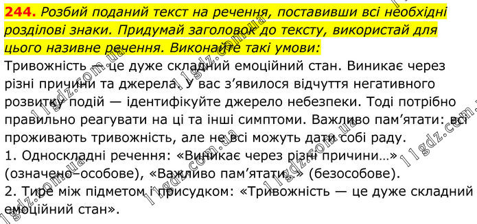 244. Розбий поданий текст на речення, поставивши всі необхідні розділові знаки. Придумай заголовок до тексту, використай для цього називне речення. Виконайте такі умови: Тривожність — це дуже складний емоційний стан. Виникає через різні причини та джерела. У вас з’явилося відчуття негативного розвитку подій — ідентифікуйте джерело небезпеки. Тоді потрібно правильно реагувати на ці та інші симптоми. Важливо пам’ятати: всі проживають тривожність, але не всі можуть дати собі раду. 1. Односкладні речення: «Виникає через різні причини…» (означено–особове), «Важливо пам’ятати…» (безособове). 2. Тире між підметом і присудком: «Тривожність — це дуже складний емоційний стан».