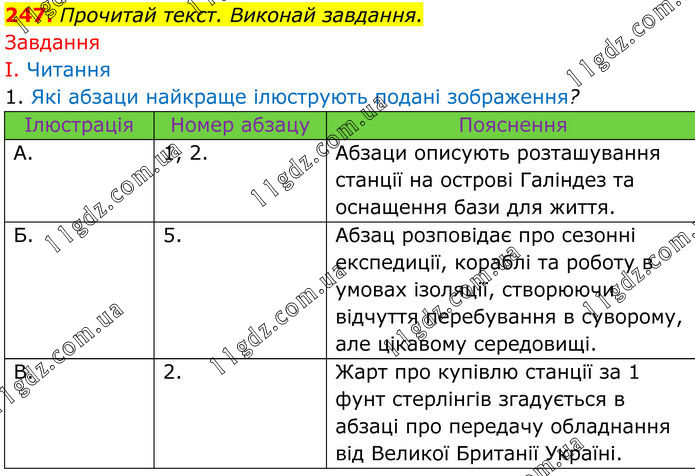 247. Прочитай текст. Виконай завдання. Завдання І. Читання 1. Які абзаци найкраще ілюструють подані зображення? Ілюстрація Номер абзацу Пояснення А. 1, 2. Абзаци описують розташування станції на острові Галіндез та оснащення бази для життя. Б. 5. Абзац розповідає про сезонні експедиції, кораблі та роботу в умовах ізоляції, створюючи відчуття перебування в суворому, але цікавому середовищі. В. 2. Жарт про купівлю станції за 1 фунт стерлінгів згадується в абзаці про передачу обладнання від Великої Британії Україні.