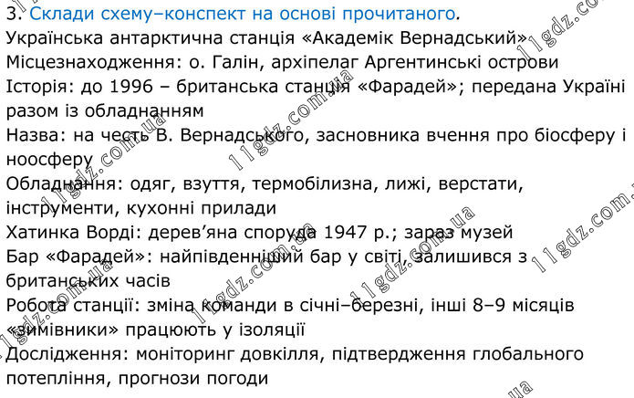 3. Склади схему–конспект на основі прочитаного. Українська антарктична станція «Академік Вернадський» Місцезнаходження: о. Галін, архіпелаг Аргентинські острови Історія: до 1996 – британська станція «Фарадей»; передана Україні разом із обладнанням Назва: на честь В. Вернадського, засновника вчення про біосферу і ноосферу Обладнання: одяг, взуття, термобілизна, лижі, верстати, інструменти, кухонні прилади Хатинка Ворді: дерев’яна споруда 1947 р.; зараз музей Бар «Фарадей»: найпівденніший бар у світі, залишився з британських часів Робота станції: зміна команди в січні–березні, інші 8–9 місяців «зимівники» працюють у ізоляції Дослідження: моніторинг довкілля, підтвердження глобального потепління, прогнози погоди.