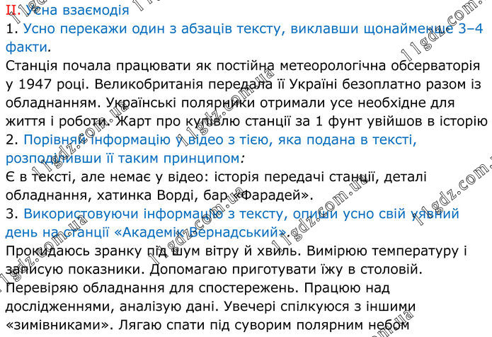 ІІ. Усна взаємодія 1. Усно перекажи один з абзаців тексту, виклавши щонайменше 3–4 факти. Станція почала працювати як постійна метеорологічна обсерваторія у 1947 році. Великобританія передала її Україні безоплатно разом із обладнанням. Українські полярники отримали усе необхідне для життя і роботи. Жарт про купівлю станції за 1 фунт увійшов в історію 2. Порівняй інформацію у відео з тією, яка подана в тексті, розподіливши її таким принципом: Є в тексті, але немає у відео: історія передачі станції, деталі обладнання, хатинка Ворді, бар «Фарадей». 3. Використовуючи інформацію з тексту, опиши усно свій уявний день на станції «Академік Вернадський». Прокидаюсь зранку під шум вітру й хвиль. Вимірюю температуру і записую показники. Допомагаю приготувати їжу в столовій. Перевіряю обладнання для спостережень. Працюю над дослідженнями, аналізую дані. Увечері спілкуюся з іншими «зимівниками». Лягаю спати під суворим полярним небом.