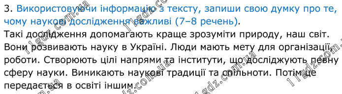 3. Використовуючи інформацію з тексту, запиши свою думку про те, чому наукові дослідження важливі (7–8 речень). Такі дослідження допомагають краще зрозуміти природу, наш світ. Вони розвивають науку в Україні. Люди мають мету для організації, роботи. Створюють цілі напрями та інститути, що досліджують певну сферу науки. Виникають наукові традиції та спільноти. Потім це передається в освіті іншим.