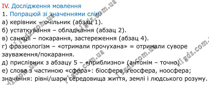 IV. Дослідження мовлення 1. Попрацюй зі значеннями слів: а) керівник – очільник (абзац 1). б) устаткування – обладнання (абзац 2). в) санкції – покарання, застереження (абзац 4). г) фразеологізм – «отримали прочухана» = отримали суворе зауваження/покарання. д) прислівник з абзацу 5 – «приблизно» (антонім – точно). е) слова з частиною «сфера»: біосфера, геосфера, ноосфера; значення: рівні/шари середовища життя, землі і людського розуму.