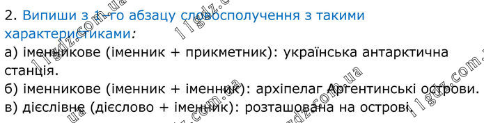 2. Випиши з 1–го абзацу словосполучення з такими характеристиками: а) іменникове (іменник + прикметник): українська антарктична станція. б) іменникове (іменник + іменник): архіпелаг Аргентинські острови. в) дієслівне (дієслово + іменник): розташована на острові.