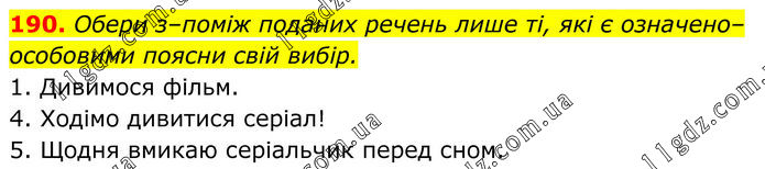190. Обери з–поміж поданих речень лише ті, які є означено–особовими поясни свій вибір. 1. Дивимося фільм. 4. Ходімо дивитися серіал! 5. Щодня вмикаю серіальчик перед сном.