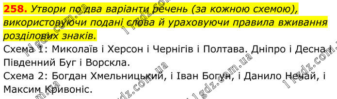 258. Утвори по два варіанти речень (за кожною схемою), використовуючи подані слова й ураховуючи правила вживання розділових знаків. Схема 1: Миколаїв і Херсон і Чернігів і Полтава. Дніпро і Десна і Південний Буг і Ворскла. Схема 2: Богдан Хмельницький, і Іван Богун, і Данило Нечай, і Максим Кривоніс.