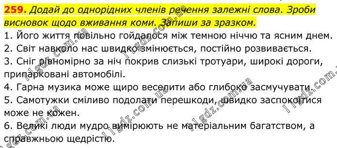 259. Додай до однорідних членів речення залежні слова. Зроби висновок щодо вживання коми. Запиши за зразком. 1. Його життя повільно гойдалося між темною ніччю та ясним днем. 2. Світ навколо нас швидко змінюється, постійно розвивається. 3. Сніг рівномірно за ніч покрив слизькі тротуари, широкі дороги, припарковані автомобілі. 4. Гарна музика може щиро веселити або глибоко засмучувати. 5. Самотужки сміливо подолати перешкоди, швидко заспокоїтися може не кожен. 6. Великі люди мудро вимірюють не матеріальним багатством, а справжньою щедрістю.