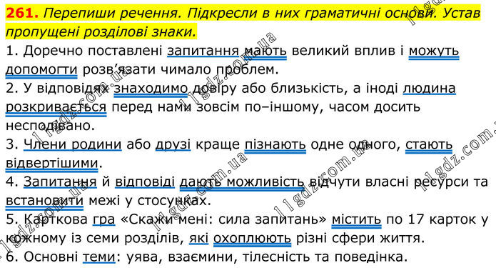 261. Перепиши речення. Підкресли в них граматичні основи. Устав пропущені розділові знаки. 1. Доречно поставлені запитання мають великий вплив і можуть допомогти розв’язати чимало проблем. 2. У відповідях знаходимо довіру або близькість, а іноді людина розкривається перед нами зовсім по–іншому, часом досить несподівано. 3. Члени родини або друзі краще пізнають одне одного, стають відвертішими. 4. Запитання й відповіді дають можливість відчути власні ресурси та встановити межі у стосунках. 5. Карткова гра «Скажи мені: сила запитань» містить по 17 карток у кожному із семи розділів, які охоплюють різні сфери життя. 6. Основні теми: уява, взаємини, тілесність та поведінка.