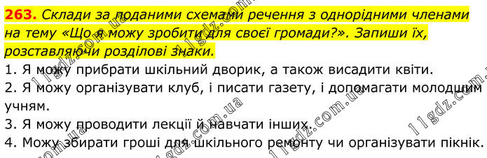263. Склади за поданими схемами речення з однорідними членами на тему «Що я можу зробити для своєї громади?». Запиши їх, розставляючи розділові знаки. 1. Я можу прибрати шкільний дворик, а також висадити квіти. 2. Я можу організувати клуб, і писати газету, і допомагати молодшим учням. 3. Я можу проводити лекції й навчати інших. 4. Можу збирати гроші для шкільного ремонту чи організувати пікнік.