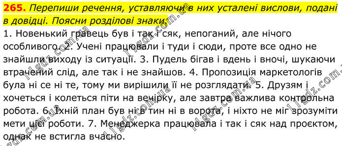 265. Перепиши речення, уставляючи в них усталені вислови, подані в довідці. Поясни розділові знаки. 1. Новенький гравець був і так і сяк, непоганий, але нічого особливого. 2. Учені працювали і туди і сюди, проте все одно не знайшли виходу із ситуації. 3. Пудель бігав і вдень і вночі, шукаючи втрачений слід, але так і не знайшов. 4. Пропозиція маркетологів була ні се ні те, тому ми вирішили її не розглядати. 5. Друзям і хочеться і колеться піти на вечірку, але завтра важлива контрольна робота. 6. Їхній план був ні в тин ні в ворота, і ніхто не міг зрозуміти мети цієї роботи. 7. Менеджерка працювала і так і сяк над проєктом, однак не встигла вчасно.