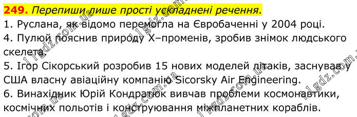 249. Перепиши лише прості ускладнені речення. 1. Руслана, як відомо перемогла на Євробаченні у 2004 році. 4. Пулюй пояснив природу Х–променів, зробив знімок людського скелета. 5. Ігор Сікорський розробив 15 нових моделей літаків, заснував у США власну авіаційну компанію Sicorsky Air Engineering. 6. Винахідник Юрій Кондратюк вивчав проблеми космонавтики, космічних польотів і конструювання міжпланетних кораблів.