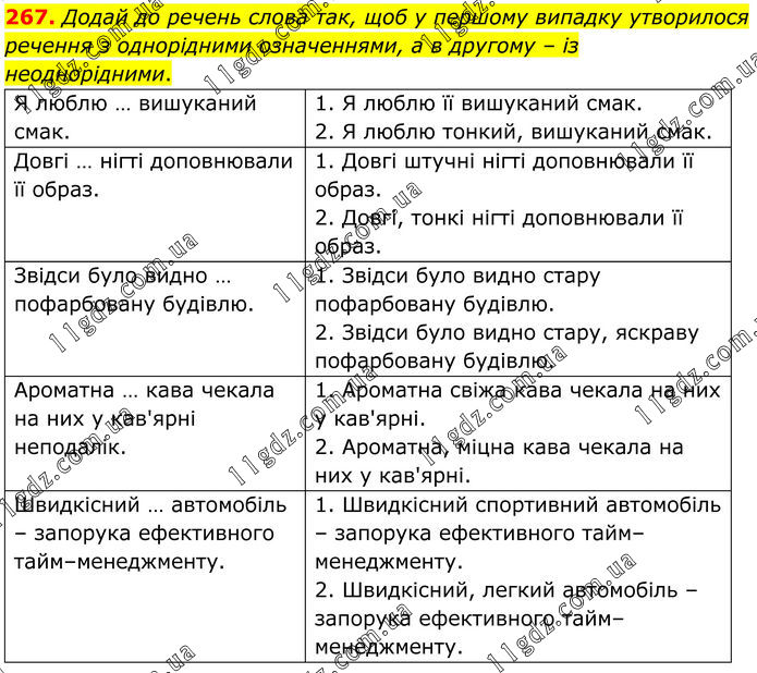 267. Додай до речень слова так, щоб у першому випадку утворилося речення з однорідними означеннями, а в другому – із неоднорідними. Я люблю … вишуканий смак. 1. Я люблю її вишуканий смак. 2. Я люблю тонкий, вишуканий смак. Довгі … нігті доповнювали її образ. 1. Довгі штучні нігті доповнювали її образ. 2. Довгі, тонкі нігті доповнювали її образ. Звідси було видно … пофарбовану будівлю. 1. Звідси було видно стару пофарбовану будівлю. 2. Звідси було видно стару, яскраву пофарбовану будівлю. Ароматна … кава чекала на них у кав'ярні неподалік. 1. Ароматна свіжа кава чекала на них у кав'ярні. 2. Ароматна, міцна кава чекала на них у кав'ярні. Швидкісний … автомобіль – запорука ефективного тайм–менеджменту. 1. Швидкісний спортивний автомобіль – запорука ефективного тайм–менеджменту. 2. Швидкісний, легкий автомобіль – запорука ефективного тайм–менеджменту.