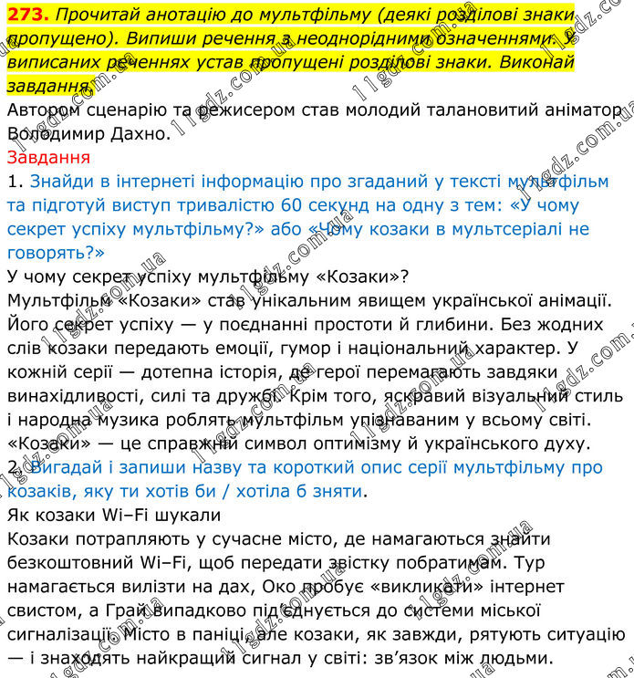 273. Прочитай анотацію до мультфільму (деякі розділові знаки пропущено). Випиши речення з неоднорідними означеннями. У виписаних реченнях устав пропущені розділові знаки. Виконай завдання. Автором сценарію та режисером став молодий талановитий аніматор Володимир Дахно. Завдання 1. Знайди в інтернеті інформацію про згаданий у тексті мультфільм та підготуй виступ тривалістю 60 секунд на одну з тем: «У чому секрет успіху мультфільму?» або «Чому козаки в мультсеріалі не говорять?» У чому секрет успіху мультфільму «Козаки»? Мультфільм «Козаки» став унікальним явищем української анімації. Його секрет успіху — у поєднанні простоти й глибини. Без жодних слів козаки передають емоції, гумор і національний характер. У кожній серії — дотепна історія, де герої перемагають завдяки винахідливості, силі та дружбі. Крім того, яскравий візуальний стиль і народна музика роблять мультфільм упізнаваним у всьому світі. «Козаки» — це справжній символ оптимізму й українського духу. 2. Вигадай і запиши назву та короткий опис серії мультфільму про козаків, яку ти хотів би / хотіла б зняти. Як козаки Wi–Fi шукали Козаки потрапляють у сучасне місто, де намагаються знайти безкоштовний Wi–Fi, щоб передати звістку побратимам. Тур намагається вилізти на дах, Око пробує «викликати» інтернет свистом, а Грай випадково під’єднується до системи міської сигналізації. Місто в паніці, але козаки, як завжди, рятують ситуацію — і знаходять найкращий сигнал у світі: зв’язок між людьми.