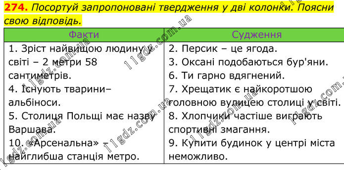 274. Посортуй запропоновані твердження у дві колонки. Поясни свою відповідь. Факти Судження 1. Зріст найвищою людину у світі – 2 метри 58 сантиметрів. 4. Існують тварини–альбіноси. 5. Столиця Польщі має назву Варшава. 10. «Арсенальна» – найглибша станція метро. 2. Персик – це ягода. 3. Оксані подобаються бур'яни. 6. Ти гарно вдягнений. 7. Хрещатик є найкоротшою головною вулицею столиці у світі. 8. Хлопчики частіше виграють спортивні змагання. 9. Купити будинок у центрі міста неможливо.
