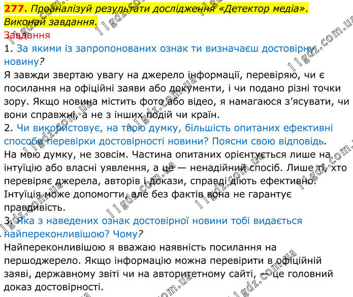 277. Проаналізуй результати дослідження «Детектор медіа». Виконай завдання. Завдання 1. За якими із запропонованих ознак ти визначаєш достовірну новину? Я завжди звертаю увагу на джерело інформації, перевіряю, чи є посилання на офіційні заяви або документи, і чи подано різні точки зору. Якщо новина містить фото або відео, я намагаюся з’ясувати, чи вони справжні, а не з інших подій чи країн. 2. Чи використовує, на твою думку, більшість опитаних ефективні способи перевірки достовірності новини? Поясни свою відповідь. На мою думку, не зовсім. Частина опитаних орієнтується лише на інтуїцію або власні уявлення, а це — ненадійний спосіб. Лише ті, хто перевіряє джерела, авторів і докази, справді діють ефективно. Інтуїція може допомогти, але без фактів вона не гарантує правдивість. 3. Яка з наведених ознак достовірної новини тобі видається найпереконливішою? Чому? Найпереконливішою я вважаю наявність посилання на першоджерело. Якщо інформацію можна перевірити в офіційній заяві, державному звіті чи на авторитетному сайті, — це головний доказ достовірності.