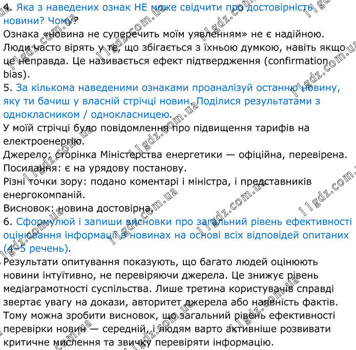 4. Яка з наведених ознак НЕ може свідчити про достовірність новини? Чому? Ознака «новина не суперечить моїм уявленням» не є надійною. Люди часто вірять у те, що збігається з їхньою думкою, навіть якщо це неправда. Це називається ефект підтвердження (confirmation bias). 5. За кількома наведеними ознаками проаналізуй останню новину, яку ти бачиш у власній стрічці новин. Поділися результатами з однокласником / однокласницею. У моїй стрічці було повідомлення про підвищення тарифів на електроенергію. Джерело: сторінка Міністерства енергетики — офіційна, перевірена. Посилання: є на урядову постанову. Різні точки зору: подано коментарі і міністра, і представників енергокомпаній. Висновок: новина достовірна. 6. Сформулюй і запиши висновки про загальний рівень ефективності оцінювання інформації в новинах на основі всіх відповідей опитаних (4–5 речень). Результати опитування показують, що багато людей оцінюють новини інтуїтивно, не перевіряючи джерела. Це знижує рівень медіаграмотності суспільства. Лише третина користувачів справді звертає увагу на докази, авторитет джерела або наявність фактів. Тому можна зробити висновок, що загальний рівень ефективності перевірки новин — середній, і людям варто активніше розвивати критичне мислення та звичку перевіряти інформацію.