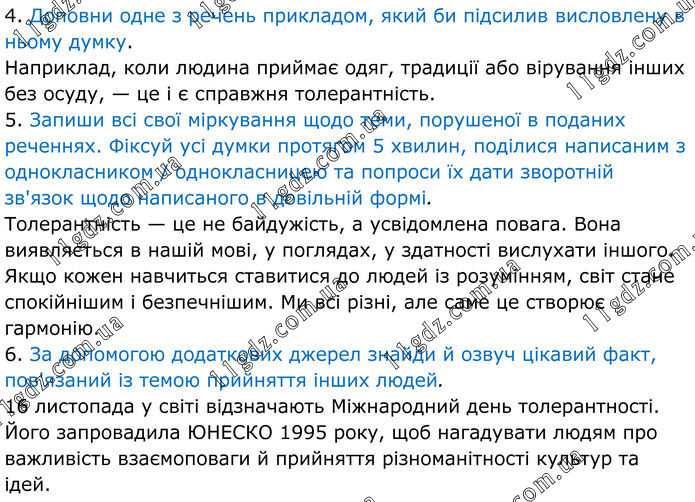 4. Доповни одне з речень прикладом, який би підсилив висловлену в ньому думку. Наприклад, коли людина приймає одяг, традиції або вірування інших без осуду, — це і є справжня толерантність. 5. Запиши всі свої міркування щодо теми, порушеної в поданих реченнях. Фіксуй усі думки протягом 5 хвилин, поділися написаним з однокласником / однокласницею та попроси їх дати зворотній зв'язок щодо написаного в довільній формі. Толерантність — це не байдужість, а усвідомлена повага. Вона виявляється в нашій мові, у поглядах, у здатності вислухати іншого. Якщо кожен навчиться ставитися до людей із розумінням, світ стане спокійнішим і безпечнішим. Ми всі різні, але саме це створює гармонію. 6. За допомогою додаткових джерел знайди й озвуч цікавий факт, пов'язаний із темою прийняття інших людей. 16 листопада у світі відзначають Міжнародний день толерантності. Його запровадила ЮНЕСКО 1995 року, щоб нагадувати людям про важливість взаємоповаги й прийняття різноманітності культур та ідей.